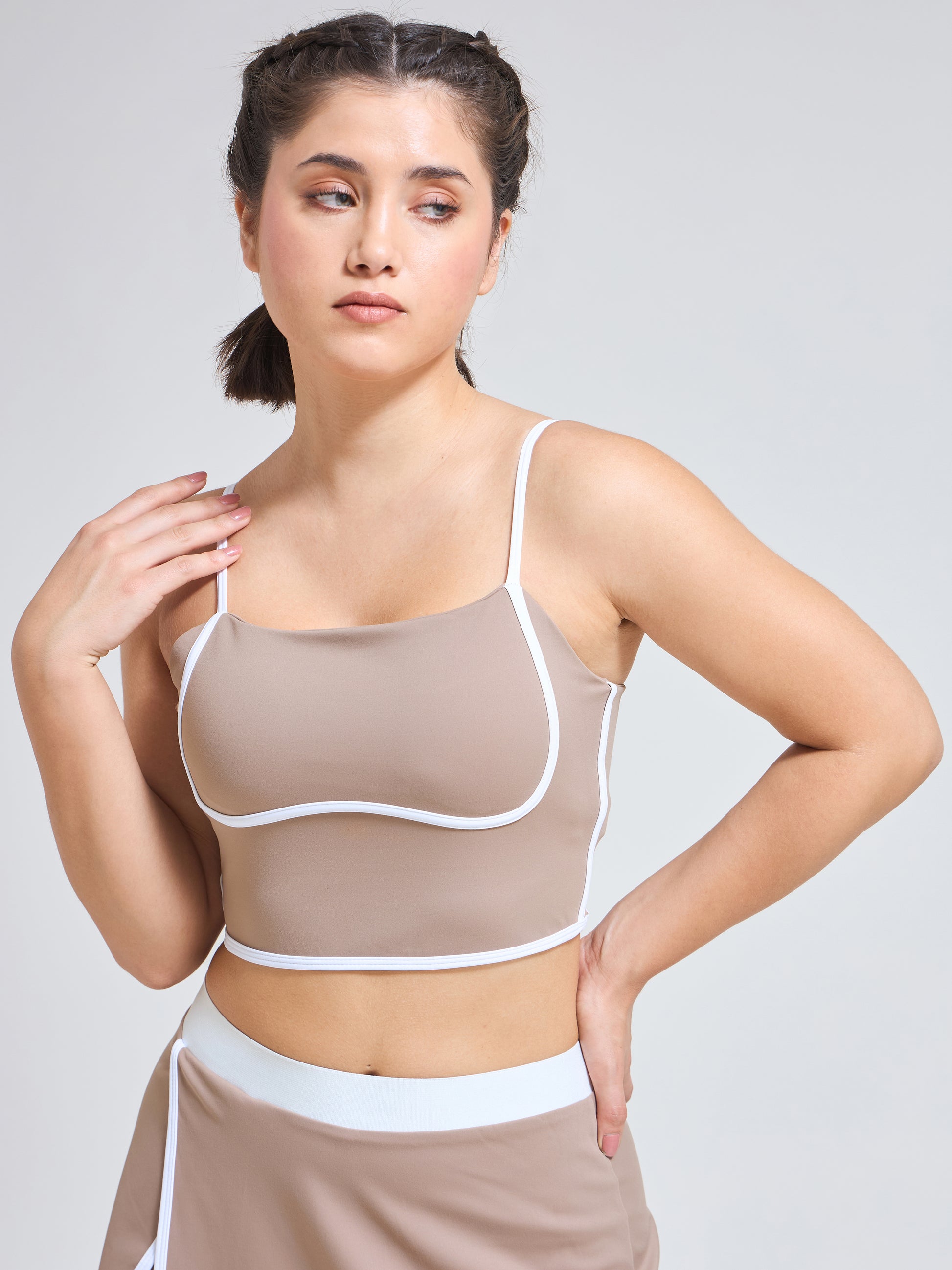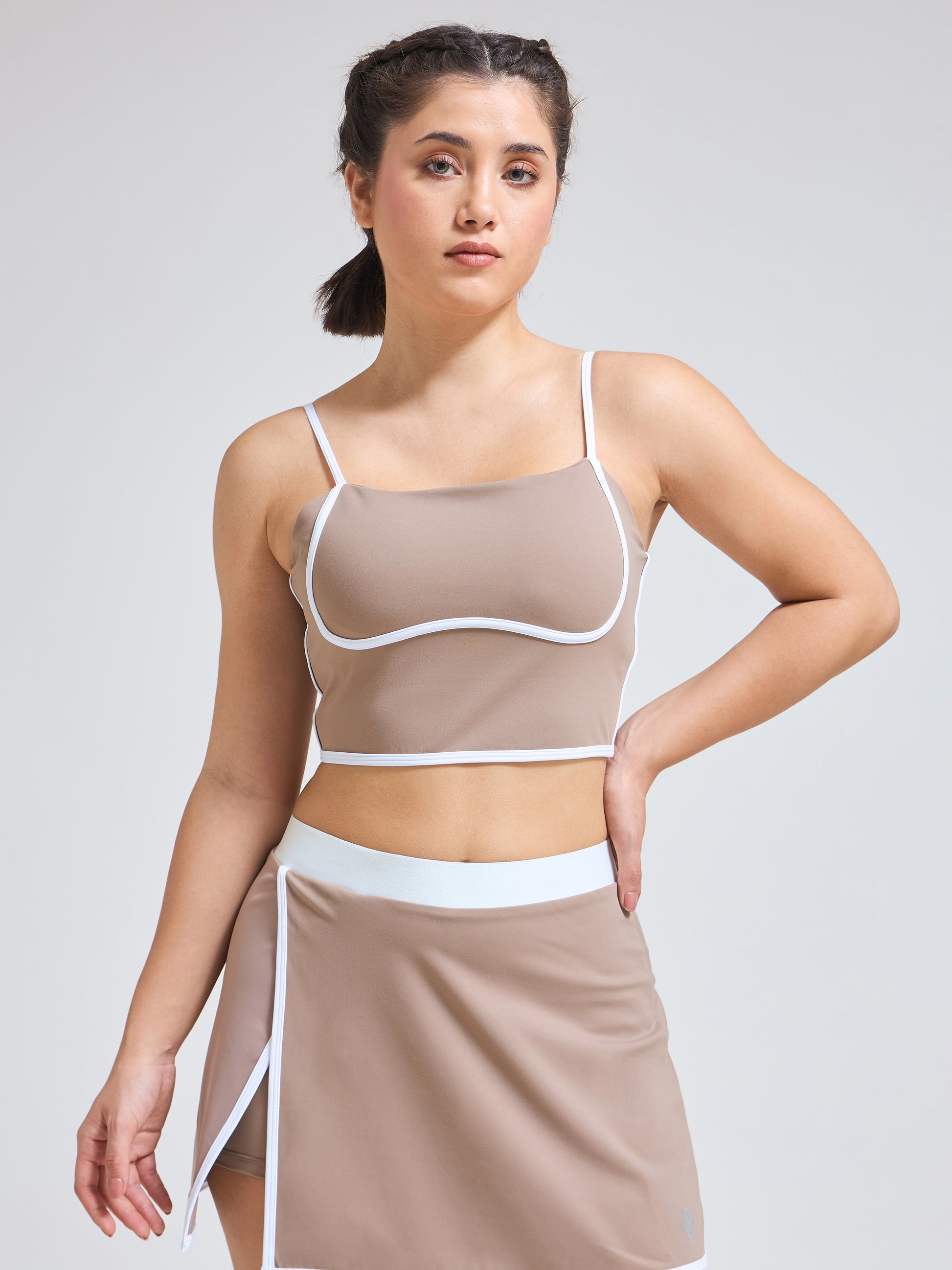 Together, the skirt and bra form a luxe, coordinated set that transitions effortlessly from studio to street. The mocha mousse tone and contrast edge detailing add a refined, modern touch—perfect for women who value both performance and aesthetic appeal.