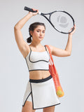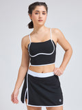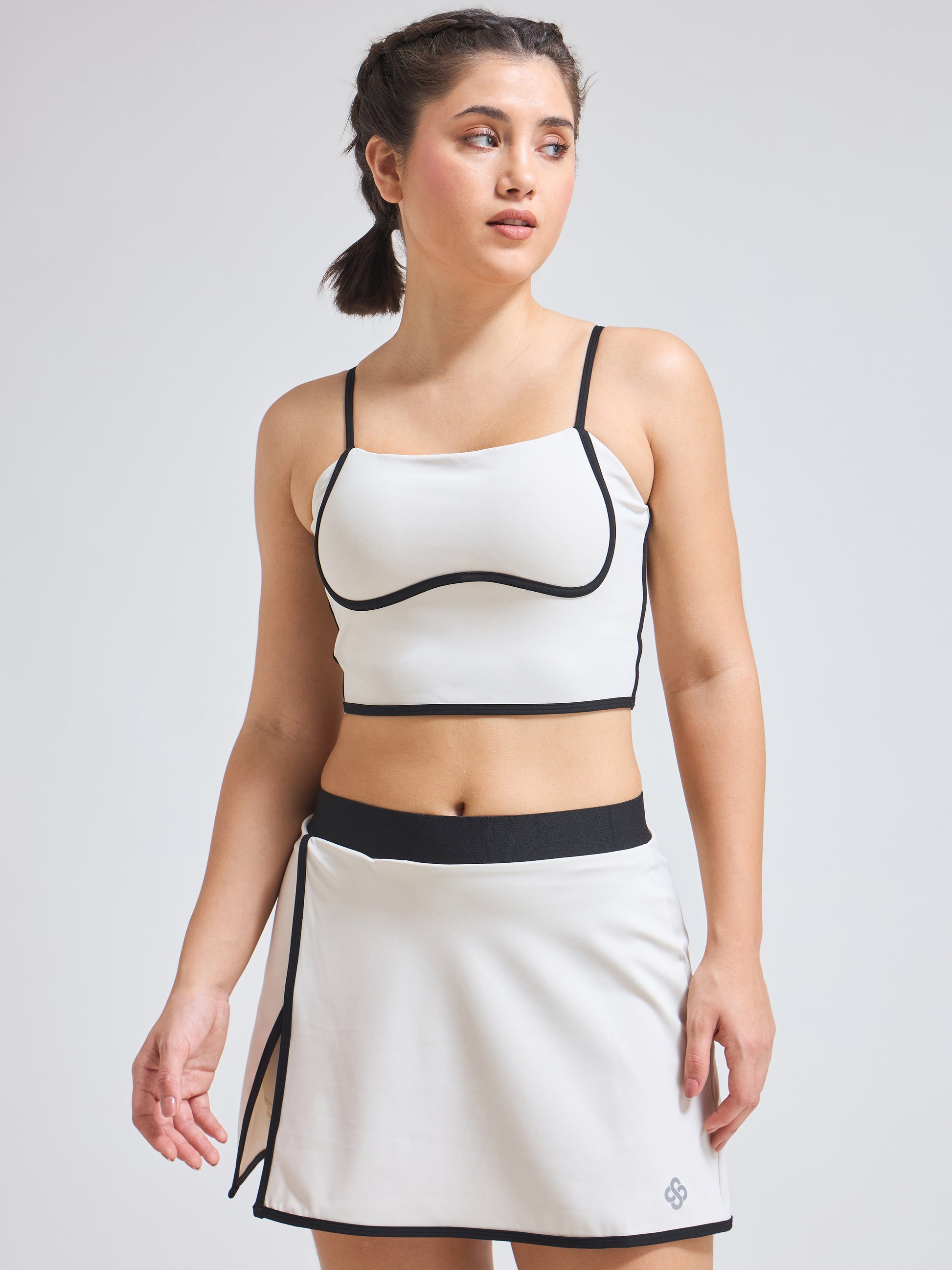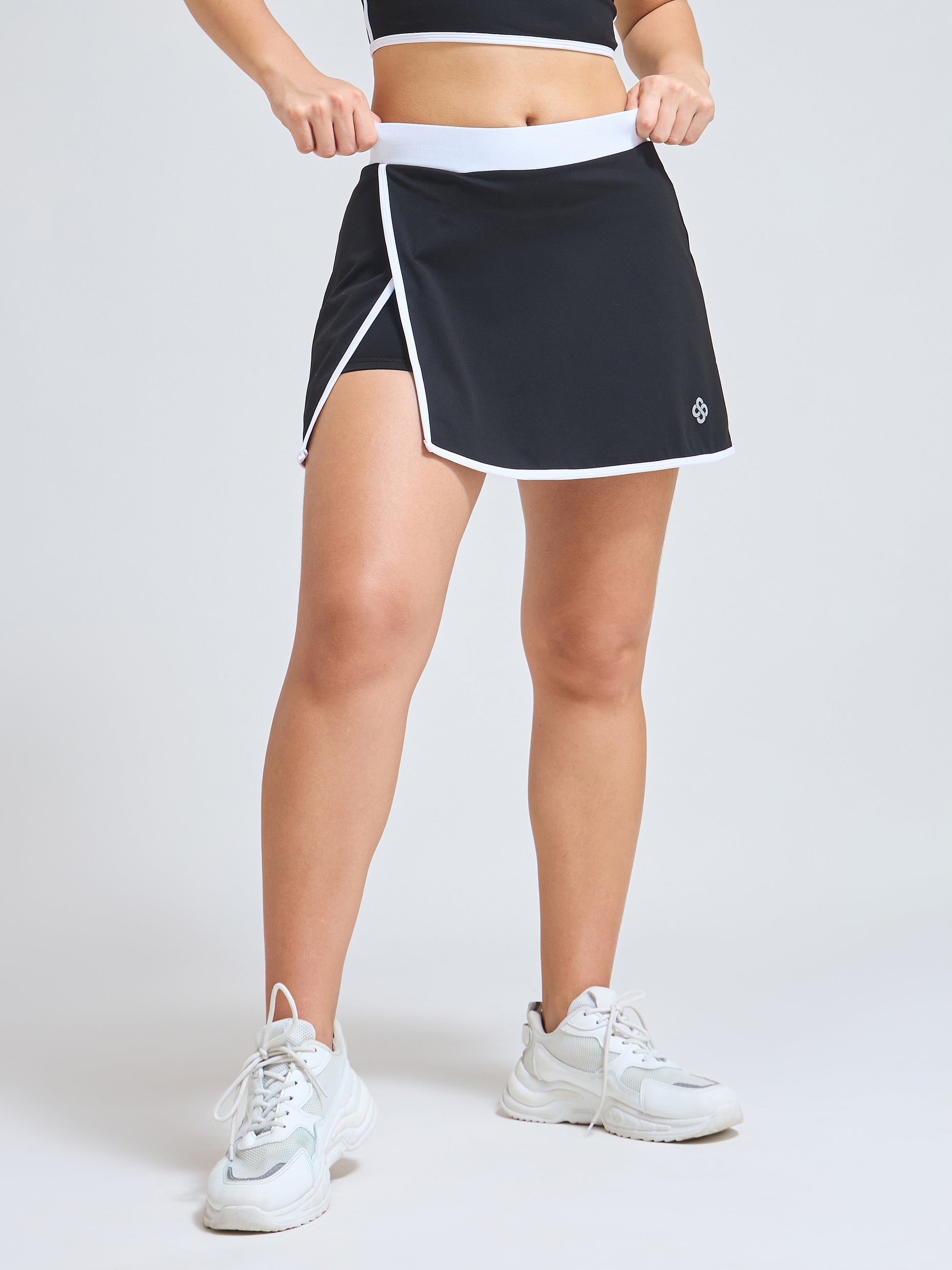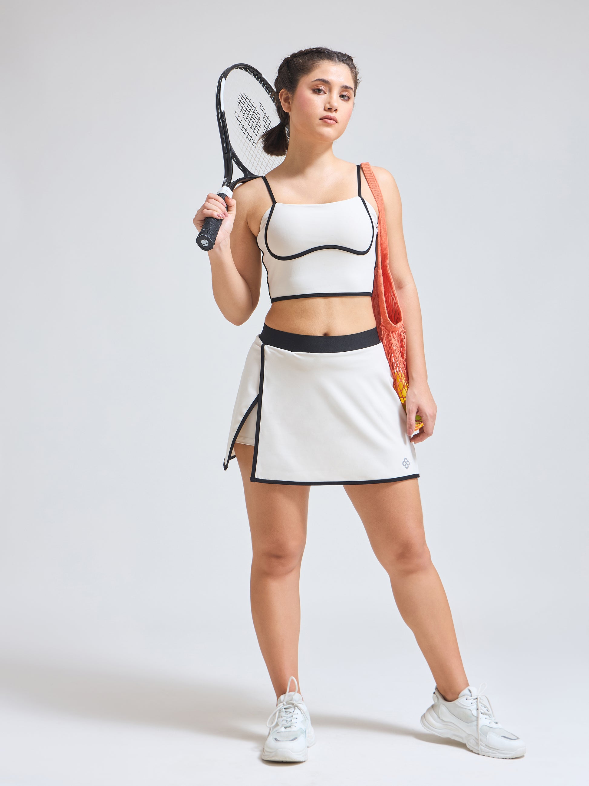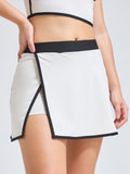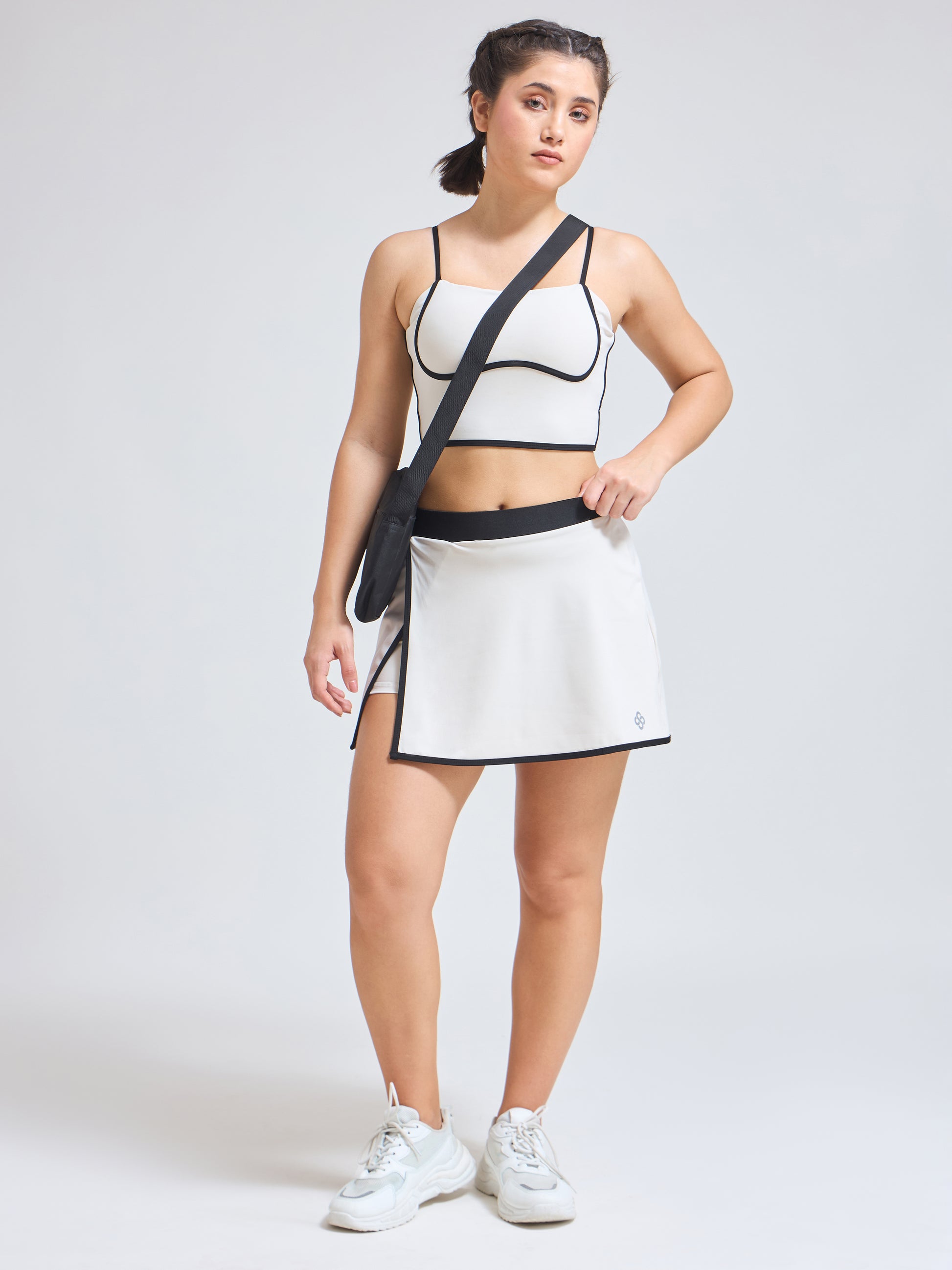 • Style: Elegant wrap skirt with contrast piping & minimalist logo; coordinated luxury sports bra