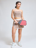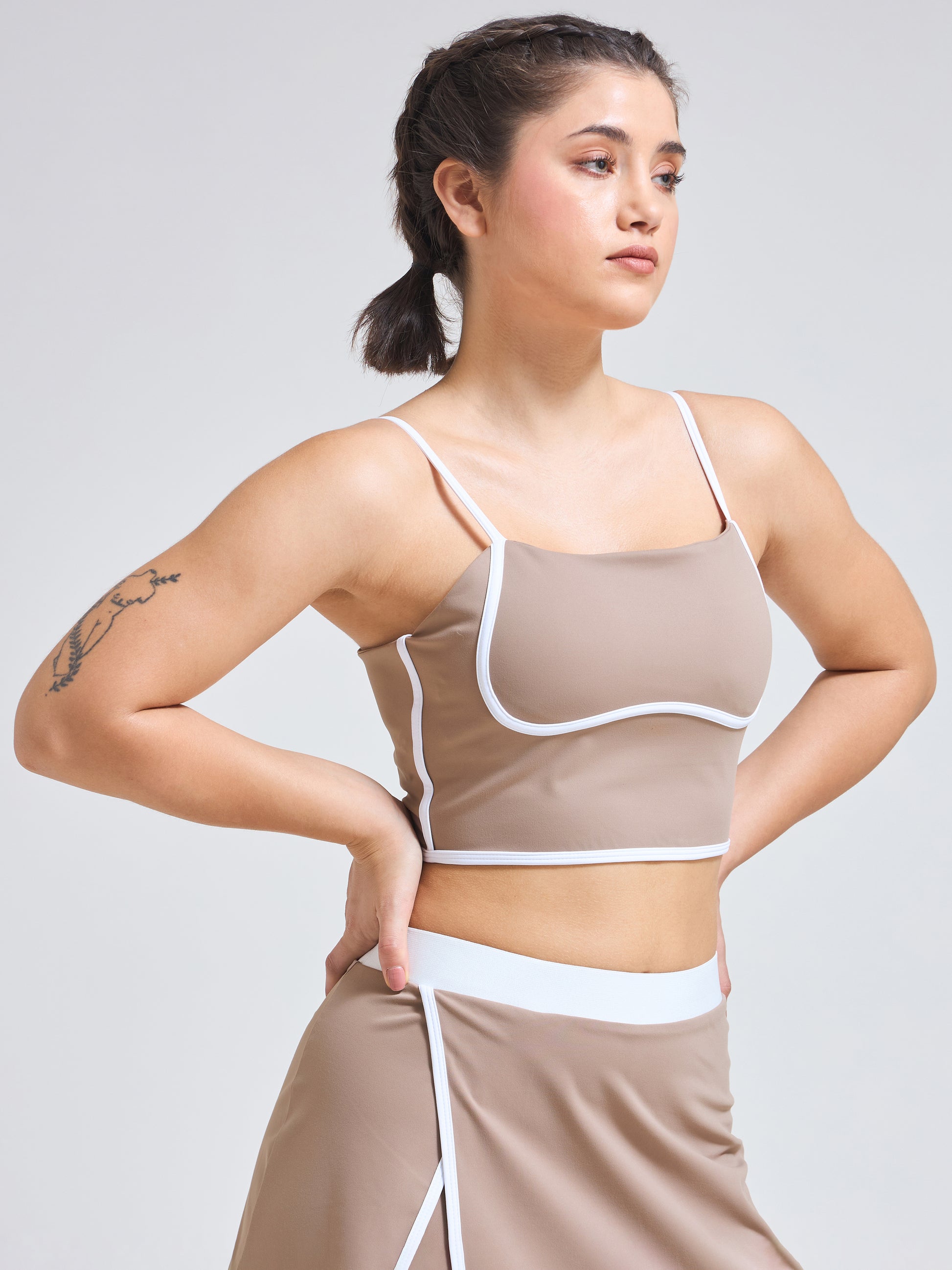 Together, the skirt and bra form a luxe, coordinated set that transitions effortlessly from studio to street. The mocha mousse tone and contrast edge detailing add a refined, modern touch—perfect for women who value both performance and aesthetic appeal.