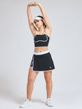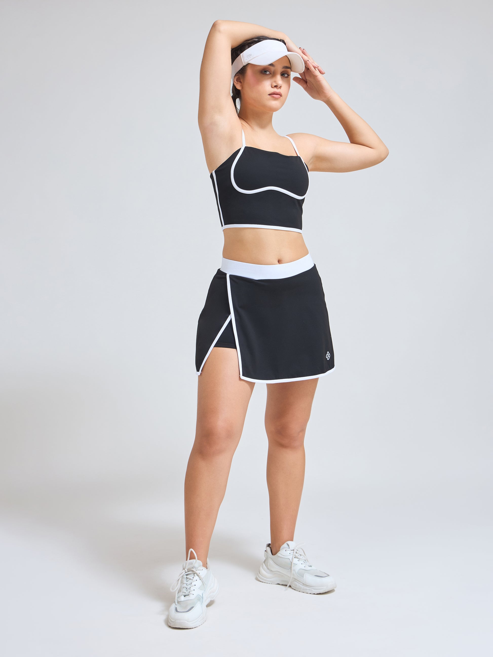• Style: Elegant wrap skirt with contrast piping & minimalist logo; coordinated luxury sports bra