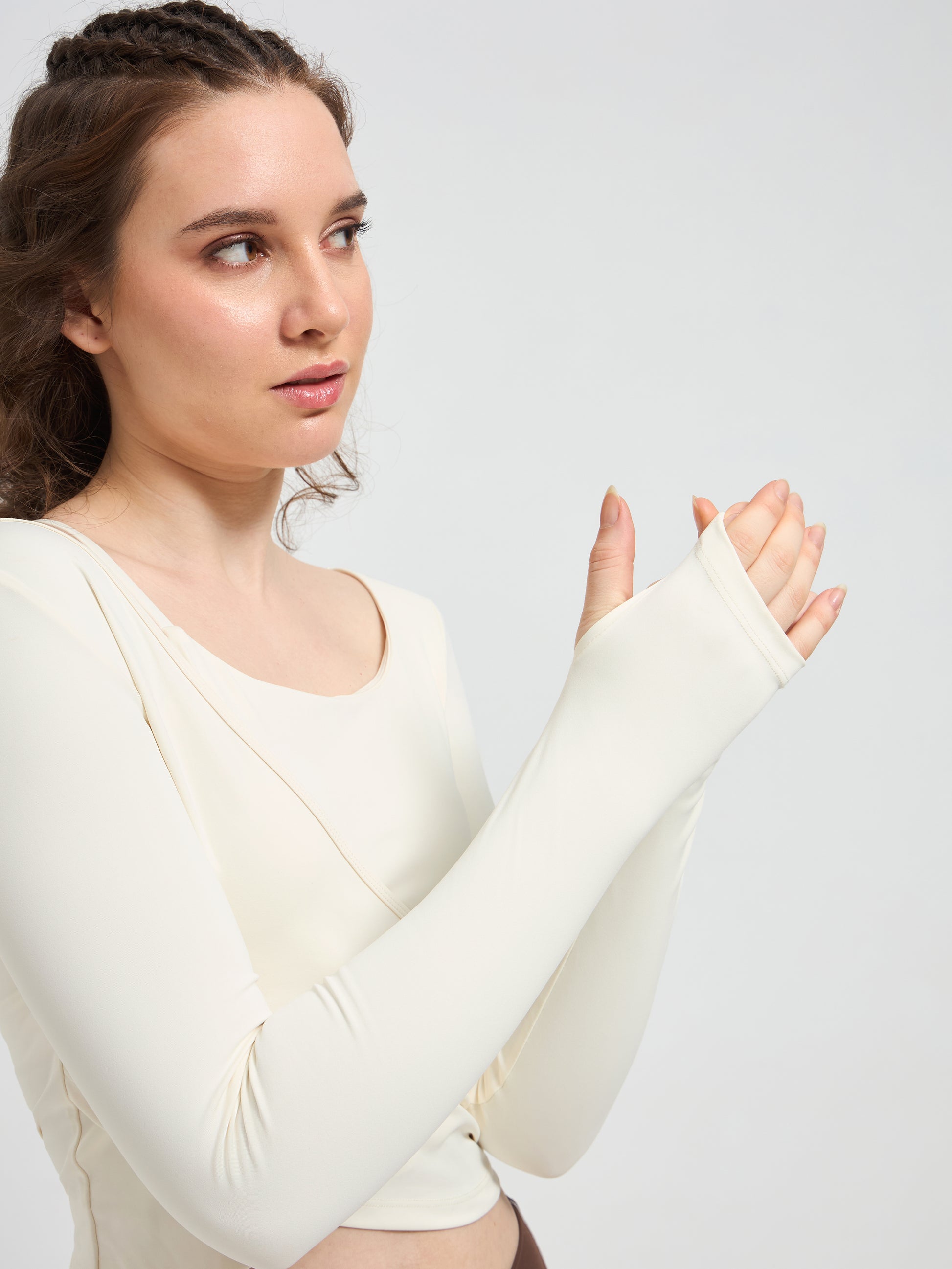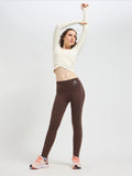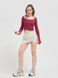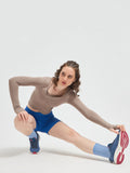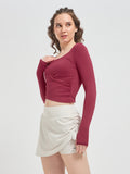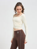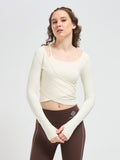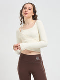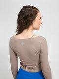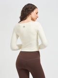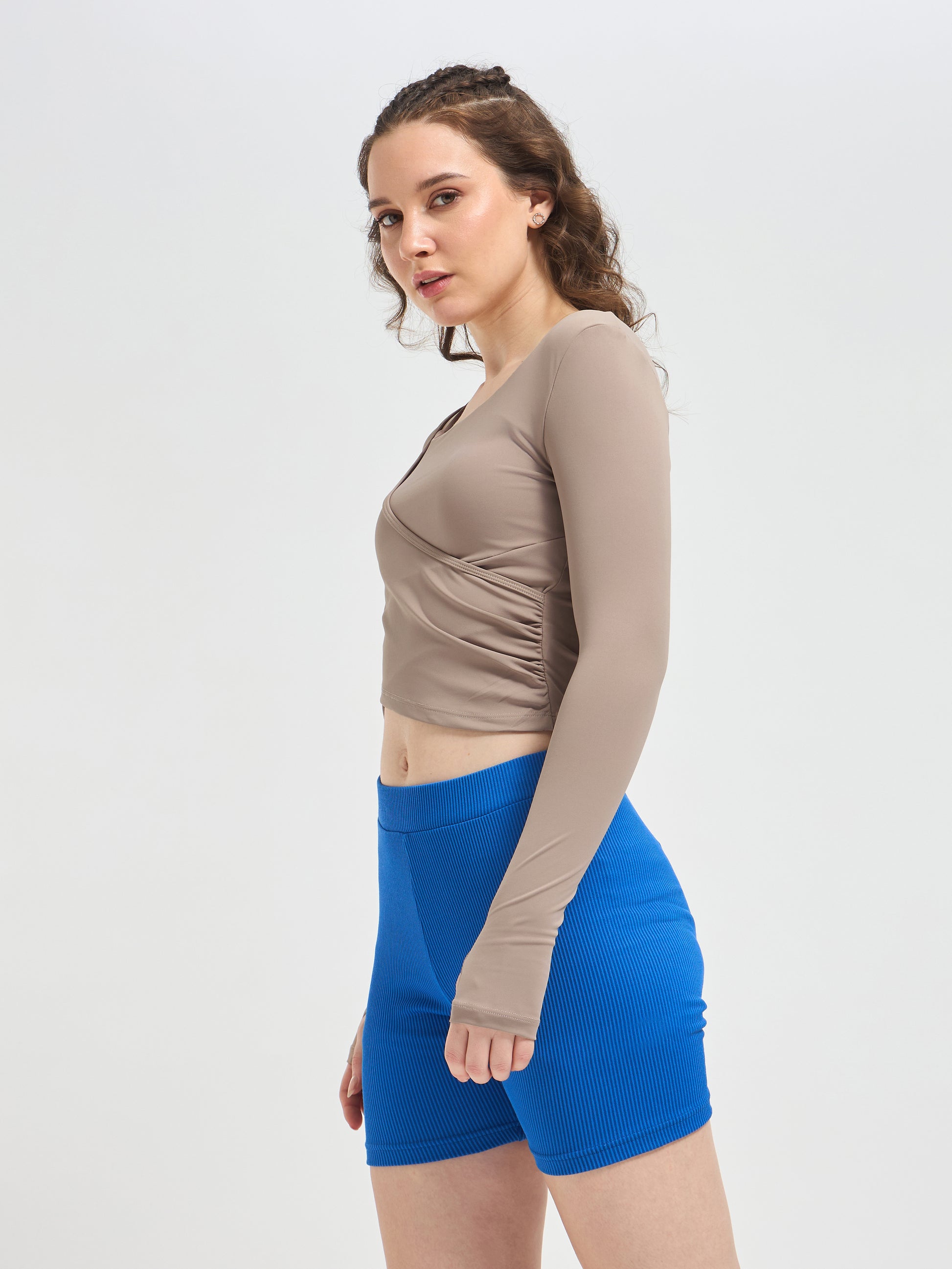 Designed with long sleeves and integrated thumbholes, this luxury fitness wear essential offers sleek coverage and a streamlined silhouette. Whether you’re flowing through yoga, training in Pilates, or styling it for luxury athleisure wear, this cropped wrap top transitions seamlessly from workout to lifestyle.