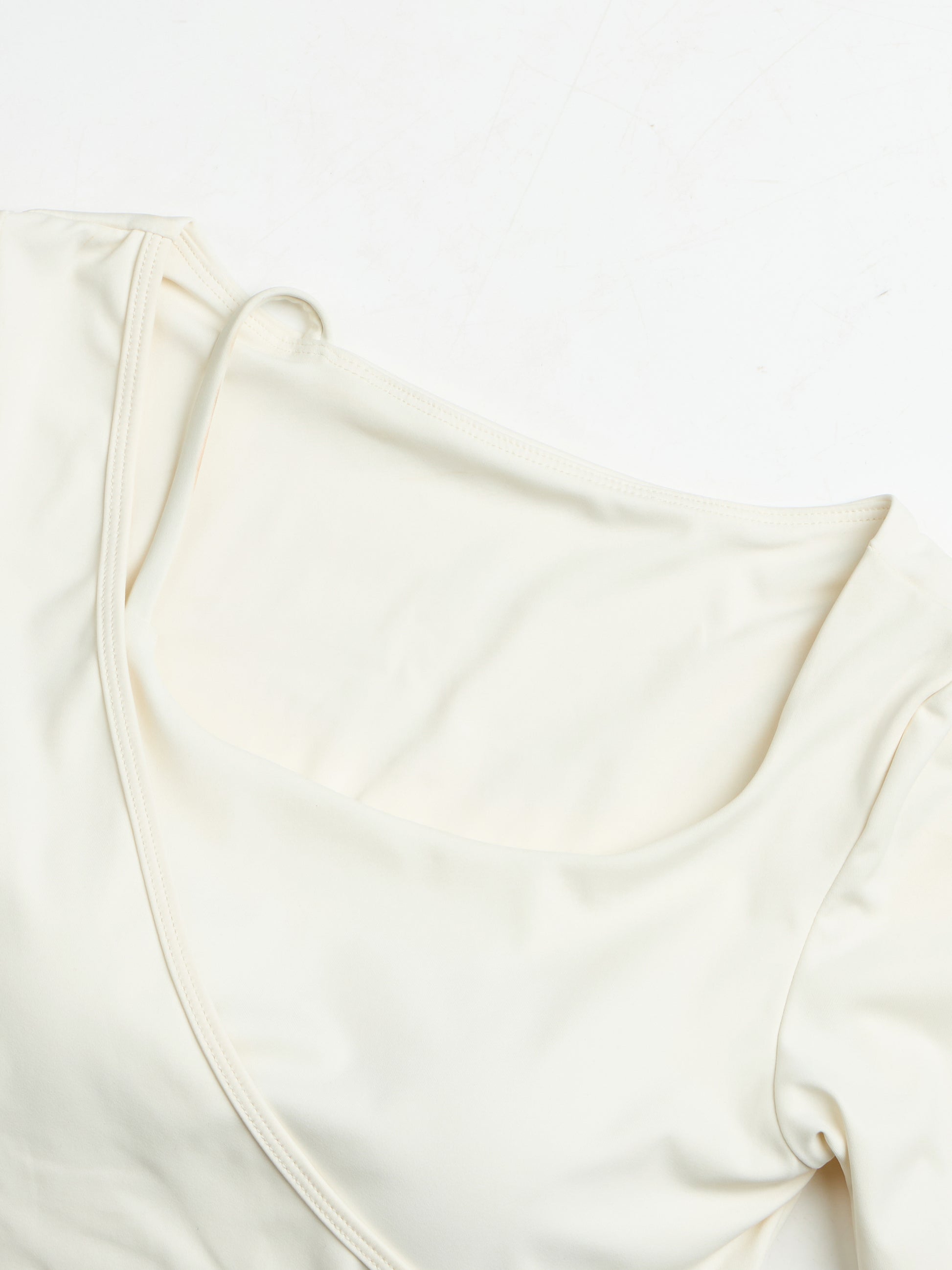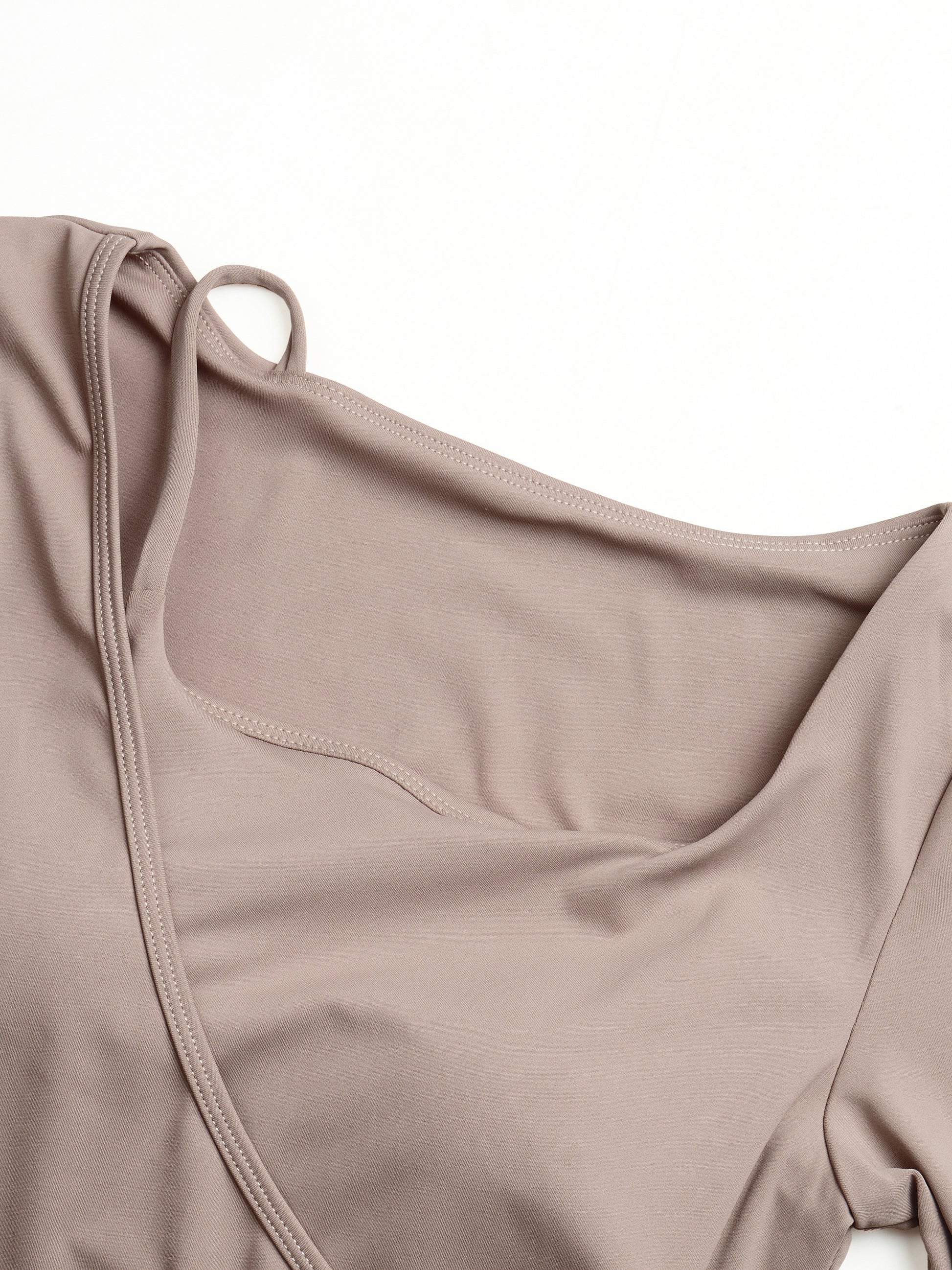 Irregular asymmetrical neckline with a stylish side-shoulder cut-out. Built-in molded cups for shaping and lift. Available in Cream Ivory, Mocha Taupe, and Wild Berry Red.